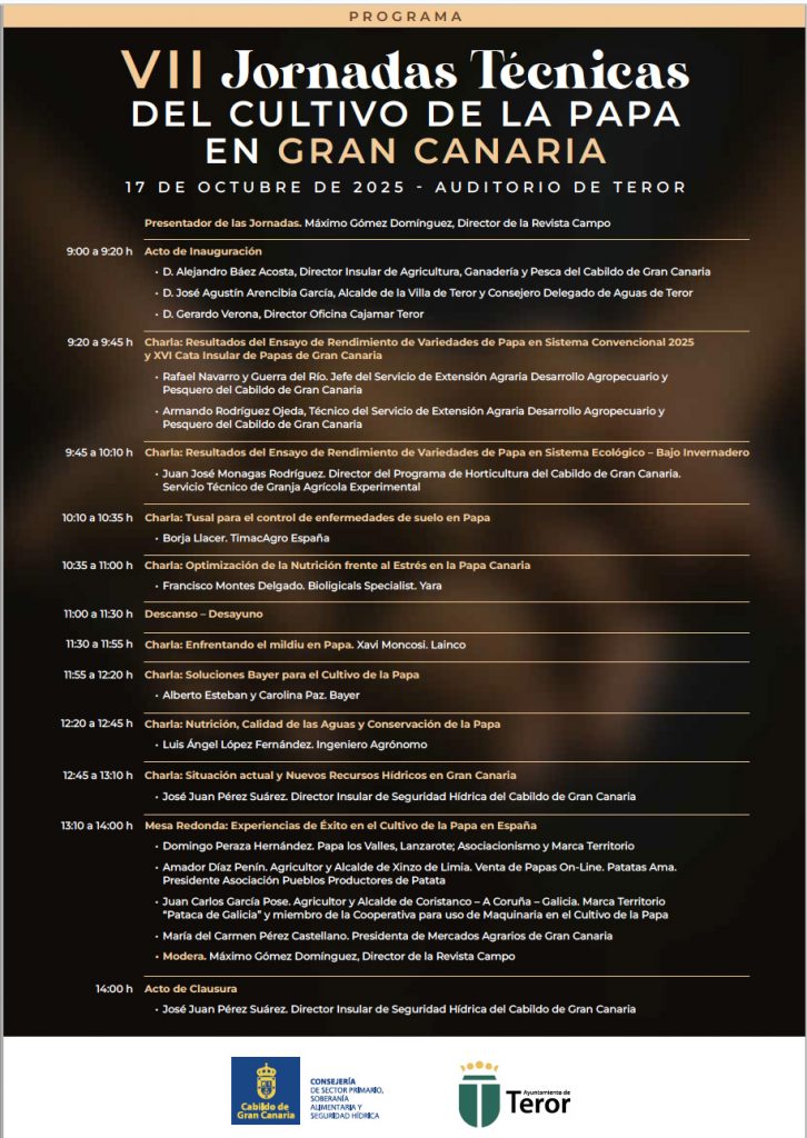 El viernes 17 se celebrarán las VII Jornadas Técnicas sobre la Papa, donde expertos insulares y nacionales presentarán mejoras en las prácticas agrícolas que contribuyen al avance de la soberanía alimentaria. Este mismo día tendrá lugar el acto institucional de entrega de los premios del Ensayo de Variedades, los resultados de la XVI Cata Insular de Papas, el Concurso de Papas de Mayor Peso y los reconocimientos a profesionales del sector.