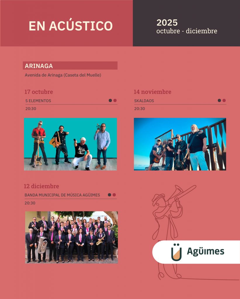 El ciclo musical ‘En Acústico’ volverá a la Caseta del Muelle de Arinaga el próximo 17 de octubre con una programación centrada en bandas locales. Las versiones de 5 Elementos, el ska-rock de Skaldaos y el tradicional Concierto de Navidad que ofrece la Banda Municipal de Agüimes serán las citas organizadas por el Ayuntamiento para esta nueva edición.
