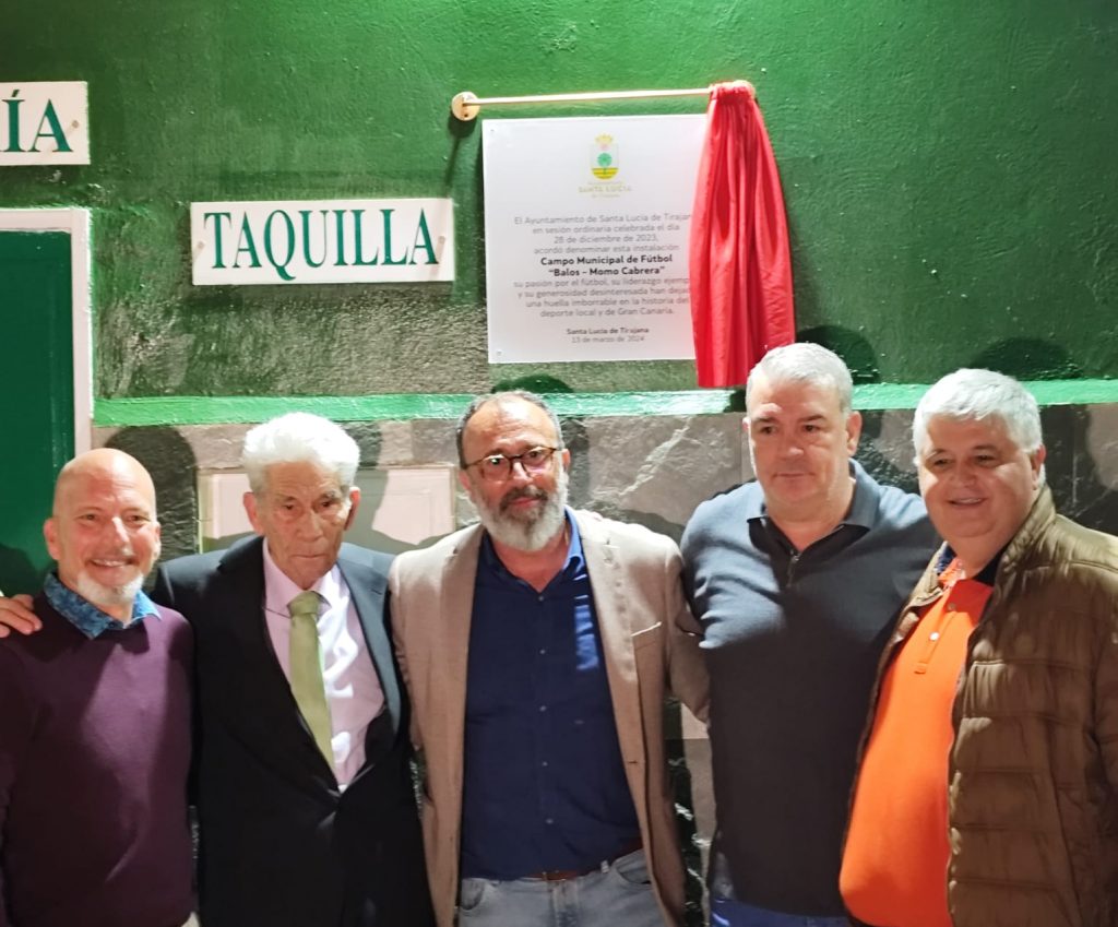 En un acto familiar y emotivo, y entre aplausos, el homenajeado descubría la placa conmemorativa en su nombre, acompañado de Francisco García, alcalde de Santa Lucía, Julio Ojeda, primer teniente de alcalde y concejal de Actividad Física y Deportes, José Juan Arencibia, presidente de la Federación Interinsular de Fútbol de Las Palmas y Momo Cabrera, presidente la Unión Deportiva Balos y homenajeado, así como de amigos y familiares que vivieron el evento con emoción por este merecido homenaje a un hombre que ha dejado su impronta imborrable en este club y en el barrio de Balos.
