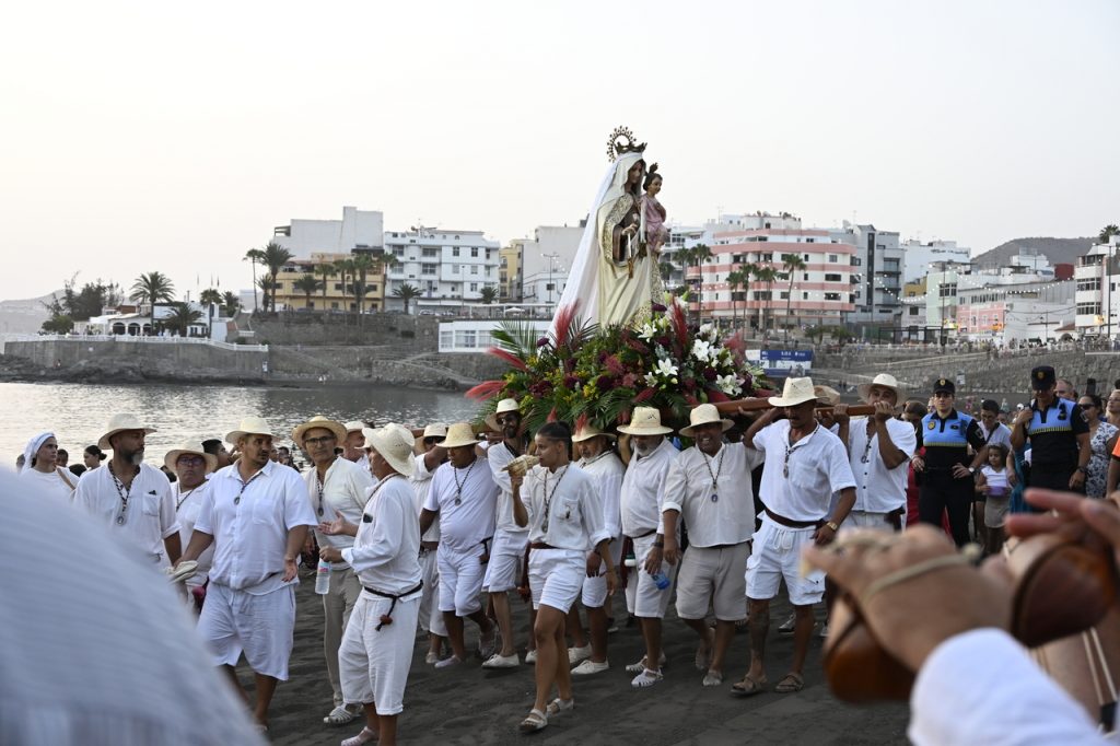 Ambos enclaves marineros celebraron de forma paralela las eucaristías en honor a la Virgen. En Arguineguín, la ceremonia tuvo lugar en el templo de la localidad, contando con ofrendas de los marineros y el acompañamiento musical de la Agrupación Folcórica Los Pescadores de Arguineguín. Al término, los bucios no se hicieron esperar, llenándose la plaza anexa de fieles que entre aplausos esperaron la salida de la imagen al pórtico. Desde este punto, una cuarentena de vecinos y vecinas, muchos alumnos y alumnas del Aula de Danza Folclórica de las Escuelas Artísticas de Mogán y entre estos, la propia alcaldesa de Mogán, Onalia Bueno, fueron guiando el camino de la Virgen hacia la playa de Las Marañuelas al son de las chácaras y tambores.