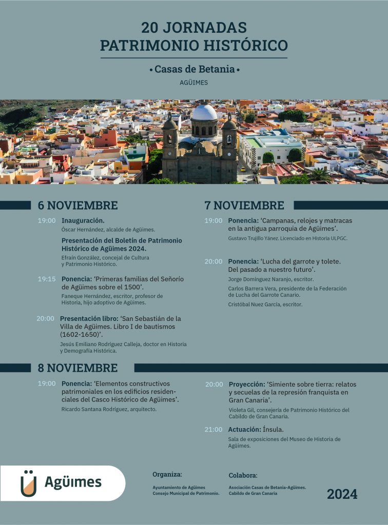 Las Casas de Betania acogerán esta semana –del miércoles 6 al viernes 8– la vigésima edición de las Jornadas de Patrimonio Histórico de Agüimes, la cita anual organizada por el Ayuntamiento y el Consejo Municipal de Patrimonio para dar a conocer diferentes aspectos de interés sobre el pasado y presente del municipio, de la isla de Gran Canaria o de Canarias en general. Todos los actos de la programación serán de entrada libre y gratuita hasta completar aforo.