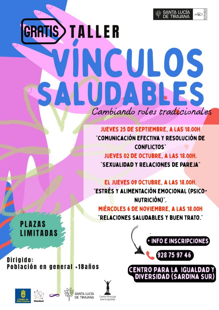 Las psicólogos Leyla Portillo y Naira León y Co-art Canarias imparten diferentes talleres desde septiembre a diciembre en la Escuela de Crecimiento Personal. El jueves 4 de septiembre a las 18 horas será el taller ‘Técnicas de gestión del estrés para reducción de la ansiedad’ a cargo de Leyla Portillo en el Centro Anexo Harimaguada. El 17 de septiembre Co-Art Canarias impartirá ‘ Mujeres que inspiran’, pintar retratos simbólicos de mujeres referentes en la historia de la comunidad. El 25 de septiembre la psicóloga Naira León impartirá el taller ‘Comunicación efectiva y resolución de conflictos’. El 2 de octubre la misma psicóloga impartirá el taller ‘Sexualidad y relaciones de pareja’. El 8 de octubre también en el Centro Anexo Harimaguada se explorará la relación con el cuerpo y la autoaceptación en el taller ‘Mi cuerpo, mi voz’ impartido por Co-Art Canarias. El 9 de octubre la psicóloga Naira León hablará de ‘Estrés y alimentación emocional’.