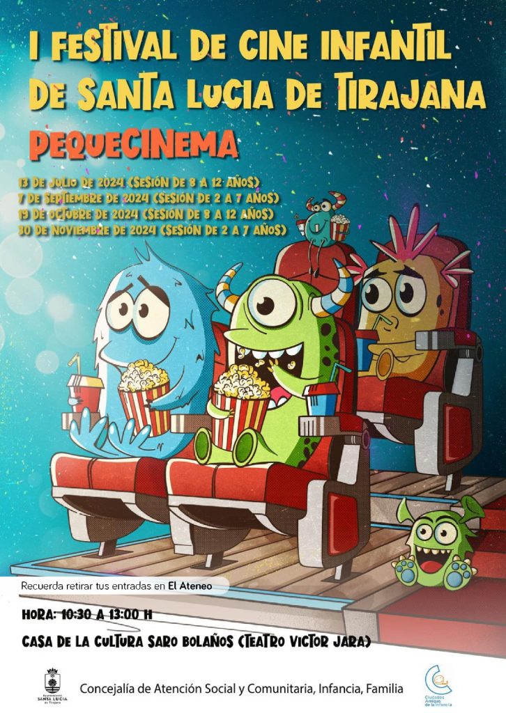 El Ayuntamiento de Santa Lucía de Tirajana, a través de la Concejalía de Infancia y Familia, impulsa el próximo sábado día 13 de julio la primera sesión del I Festival de Cine Infantil de Santa Lucía de Tirajana, Pequecinema, una iniciativa de sesiones de cortometrajes dirigidas a la infancia. Las proyecciones  se celebrarán en la Casa de la Cultura Saro Bolaños del Teatro Víctor Jara y la entrada será gratuita, pudiendo retirarse en el Ateneo Municipal de Vecindario.