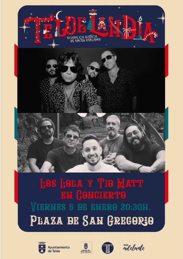 Este viernes 5 de enero, víspera del día de Reyes, Telde disfrutará de una noche cargada de música de la mano de Los Lolas y Tío Matt. Ambos grupos musicales tomarán el escenario de la plaza de San Gregorio tras la cabalgata de sus Majestades, sobre las 20.30 horas, donde los artistas sacarán su mejor repertorio para hacer bailar y disfrutar al público, en una jornada en la que se estima una importante afluencia de personas en la Zona Comercial Abierta de Los Llanos.El área de Cultura, que dirige Juan Martel, apuesta por el talento canario en una velada impregnada por la magia de los Reyes Magos. El evento musical despedirá la víspera de Reyes y pondrá fin a los actos organizados por el Ayuntamiento de Telde dentro del proyecto Teldelandia, donde los sueños se hacen realidad, que ha tenido como artífices a diferentes concejalías del Ayuntamiento de Telde.