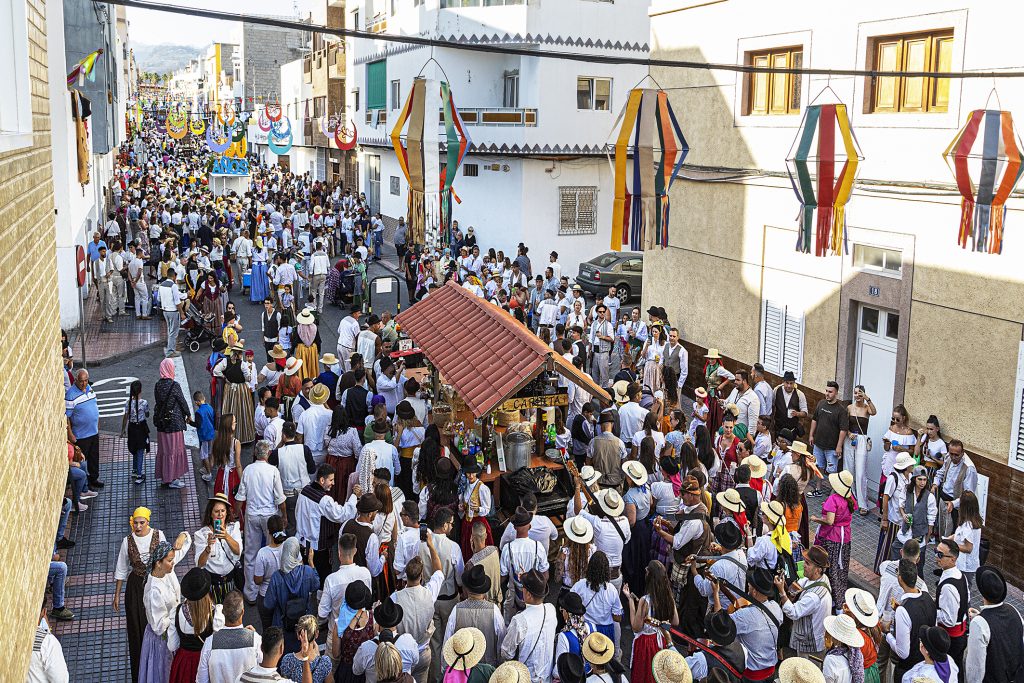 La romería estuvo encabezada por el colectivo ‘La Cuadrilla’ que deleitó durante todo el recorrido a los vecinos situados en los laterales de las calles con una exhibición del Baile del Palo al ritmo de la Agrupación Viejas Caracolas, formado por la Escuela de Música de San Bartolomé de Tirajana. Le seguían, los bailes de la Agrupación Folclórica Los Herreños, que participaron en el recorrido para celebrar la efeméride. No faltó a la cita la Romera de Honor, Mercedes Romano, portadora orgullosa de la Vara de la Romera 2024.