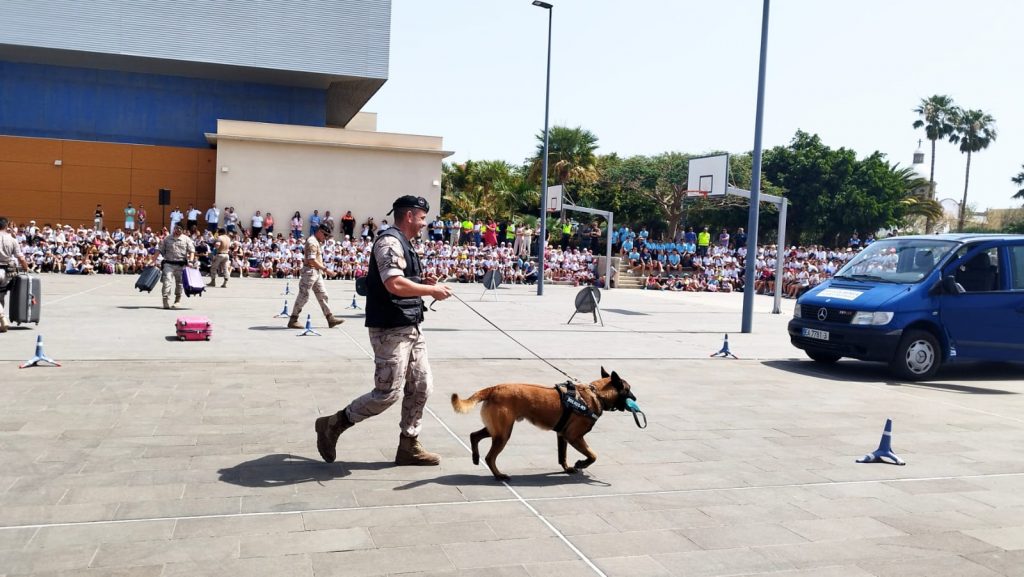 Uno de los actos más aplaudidos del encuentro fue la exhibición de los perros de la Unidad Cinológica de Gando, perteneciente a la Escuadrilla de Policía del Ala 46 del Ejército del Aire. Para deleite del alumnado, la patrulla canina realizó una demostración de cómo neutralizar a un individuo agresivo en una situación hostil. Los animales, perfectamente adiestrados, también mostraron una espectacular pericia para la detección de drogas o explosivos, ante el júbilo y la ovación de un público totalmente fascinado.