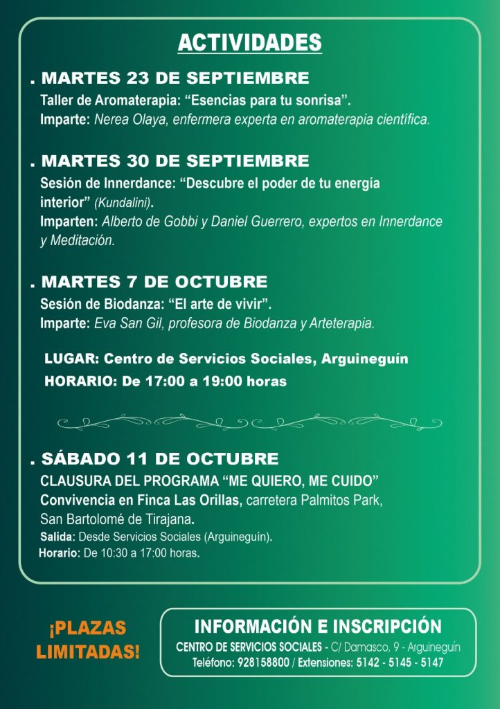 ‘Me quiero, me cuido’ forma parte de un conjunto de actividades de carácter continuo que se ha ido consolidando con el tiempo; esta es la décima edición de los talleres. Como clausura, el sábado 11 de octubre, de 10:30 a 17:00 horas, se realizará una convivencia en Finca Las Orillas (San Bartolomé de Tirajana), con carácter de aprendizaje y empoderamiento personal y colectivo. La salida tendrá lugar desde el Centro de Servicios Sociales.