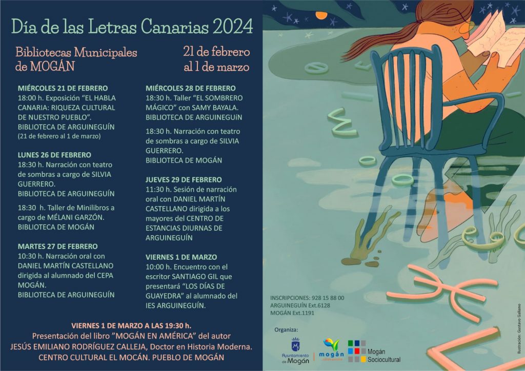 La programación arrancará el miércoles 21 de febrero con la exposición El habla canaria: riqueza cultural de nuestro pueblo en la Biblioteca Municipal de Arguineguín. En esta misma instalación se celebrará el lunes día 26  una sesión de narración con teatro de sombras a cargo de Silvia Guerrero. Mientras, en la Biblioteca Municipal de Mogán, se desarrollará un Taller de Minilibros con Mélani Garzón.
