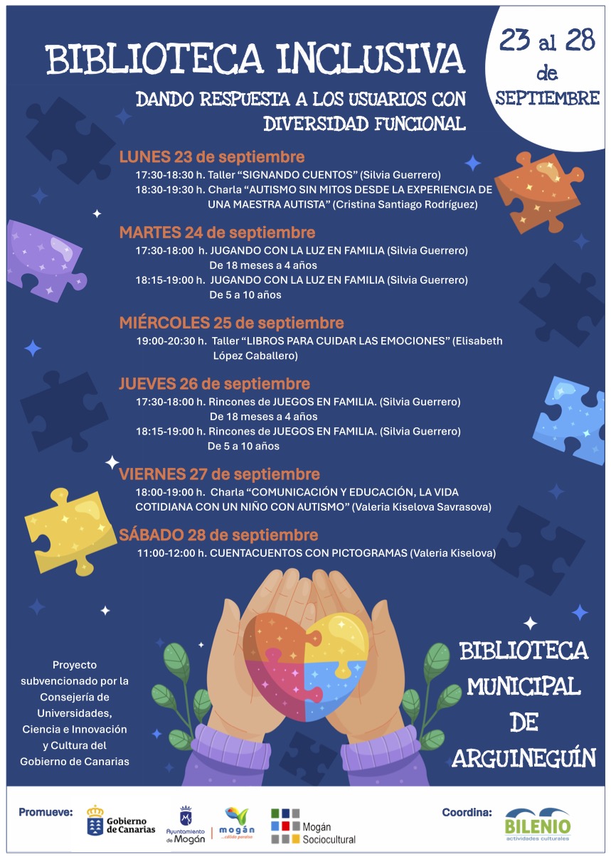 Del 23 al 28 de septiembre la Biblioteca Municipal de Arguineguín acogerá las jornadas ‘Biblioteca Inclusiva: Dando respuesta a los usuarios con diversidad funcional’. Organizadas por el Ayuntamiento de Mogán, están subvencionadas por la Consejería de Universidades, Ciencia e Innovación y Cultura del Gobierno de Canarias, y tienen como objetivo proporcionar formación y concienciación social con charlas y actividades inclusivas.