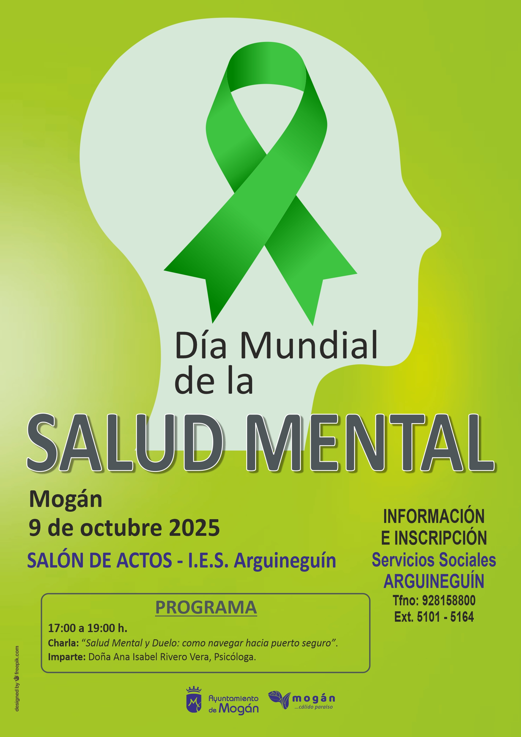 El Ayuntamiento de Mogán, a través del Servicio de Atención Psicológica, organiza una charla para conmemorar el Día Mundial de la Salud Mental el próximo 9 de octubre en el Salón de Actos del IES de Arguineguín, en horario de 17:00 a 19:00 horas.