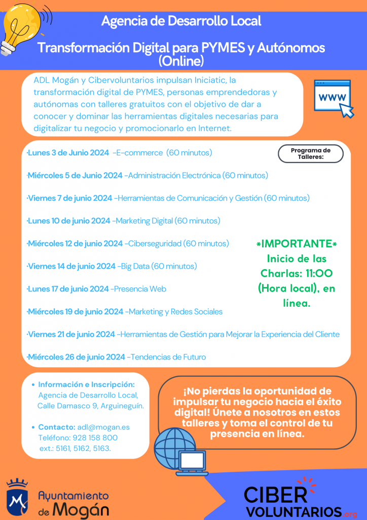La Agencia de Empleo y Desarrollo Local del Ayuntamiento Mogán colabora con la fundación Cibervoluntarios para promover el proyecto Iniciatic, talleres gratuitos online dirigidos a personas emprendedoras y autónomas con el objetivo de dar a conocer y dominar las herramientas digitales necesarias para digitalizar los negocios y promocionarlos en Internet.  Las acciones formativas, un total de diez, se desarrollarán durante el mes de junio. La inscripción ya está disponible.