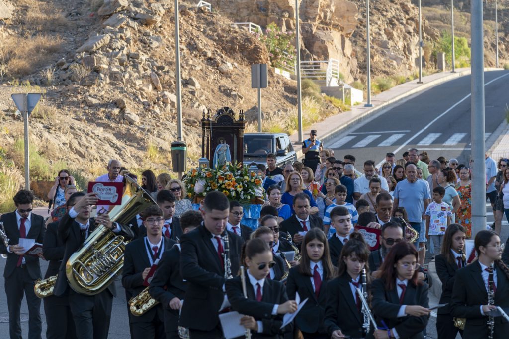 La comitiva, de la que formó parte la alcaldesa de Mogán, Onalia Bueno, y ediles de la Corporación Municipal, avanzó al paso marcado por la Banda Pasión La Aldea, que con tambores y trompetas lideró el recorrido, terminando este nuevamente en la plaza donde se sitúa el templo. No faltaron cánticos religiosos y vítores a la virgen, despedida entre aplausos tras una última pieza dedicada por la banda y el himno de María Auxiliadora.