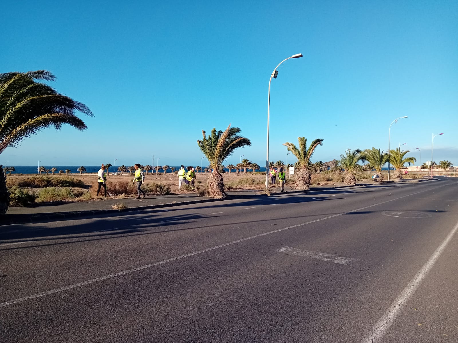 La Concejalía dirigida por Araceli Armas se apoya en trabajadores de convenio y en palmeros de Canaragua para desbrozar, podar y limpiar los palmerales y márgenes de la carretera de acceso y ajardinamientos del interior del barrio