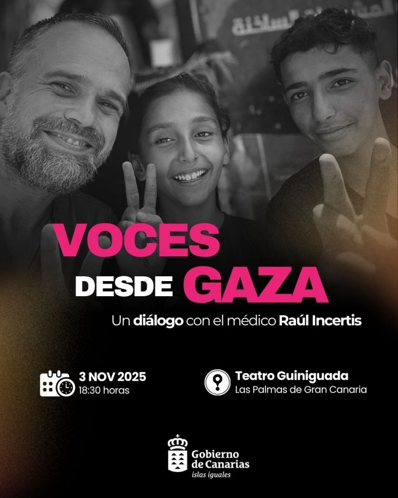 Presidencia del Gobierno de Canarias organiza el encuentro ‘Voces de Gaza, un diálogo con Raúl Incertis’, el médico de urgencias y anestesista que trabajó en la Franja como voluntario de Médicos Sin Fronteras y continúa denunciando el genocidio que ha acabado con la vida de casi 70.000 personas palestinas a manos de Israel, en torno a 20.000 de ellas menores.