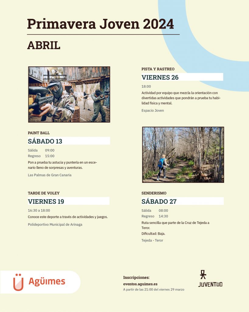 Entre las actividades programadas para el mes de abril se incluyen una excursión de senderismo desde la Cruz de Tejeda hasta Teror y una competición de paint ball en Las Palmas de Gran Canaria. También se llevarán a cabo una práctica de voleibol en el Polideportivo de Arinaga y un juego de enigmas y orientación por equipos, a realizar en el Espacio Joven del Cruce de Arinaga.