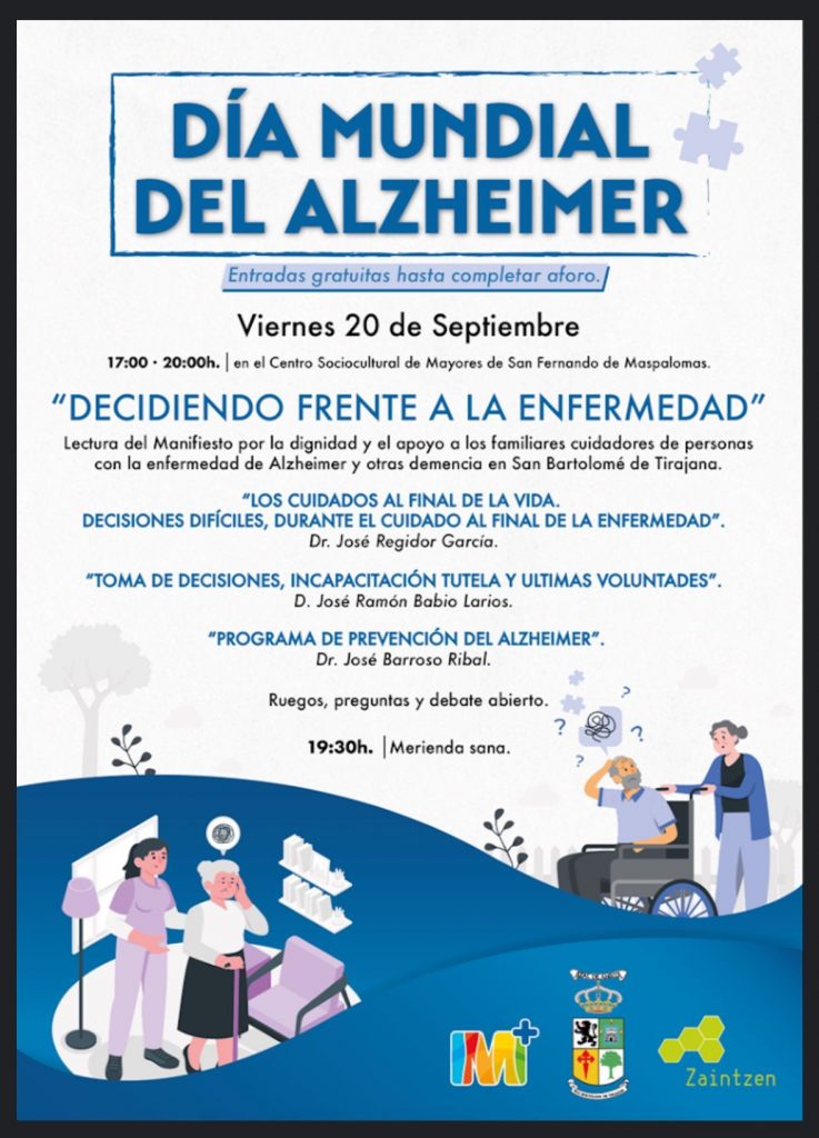 La Concejalía de Servicios Sociales y del Mayor del Ayuntamiento de San Bartolomé de Tirajana ha organizado una jornadas con motivo del Día Mundial del Alzheimer, que se celebrarán el próximo viernes 20 de septiembre, en el Centro Sociocultural de Mayores de San Fernando de Maspalomas. Bajo el lema “Decidiendo frente a la enfermedad”, estas jornadas están dirigidas a familiares, cuidadores y a la ciudadanía en general, con el objetivo de fomentar el conocimiento, la reflexión y el apoyo en torno a esta devastadora enfermedad.