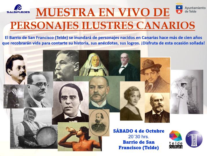 Benito Pérez Galdós, Teobaldo Power, Tomás Morales, Montiano Placeres, Fernando León y Castillo, Mercedes Pinto, José Luján Pérez, Juana Tabares, Saulo Torón, Josefina De Viera y Clavijo, José Mesa y López, Pino Apolinario y otros personajes ilustres de Canarias pasearán, este sábado 4 de octubre, por San Francisco. Una representación, ambientada en la época de inicios del siglo XX, impulsada por la Asociación Cultural Salsipuedes, que acercará esta muestra en vivo al barrio histórico teldense.