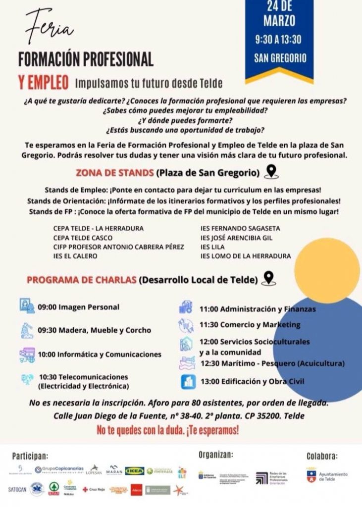 Telde se convertirá el próximo lunes 24 de marzo en un punto de encuentro clave para la formación y el empleo con la celebración de la Feria de Formación Profesional y Empleo en San Gregorio. La iniciativa, impulsada por el Gobierno de Canarias, en colaboración con el Ayuntamiento de Telde, busca ofrecer oportunidades e información a estudiantes, desempleados y a todas aquellas personas que tengan dudas en torno a su futuro laboral o que simplemente desean mejorar su empleabilidad.