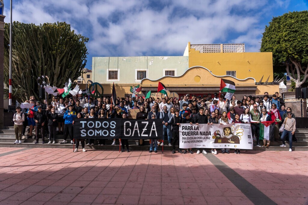 Estudiantes de todos los institutos del municipio celebraron este jueves el Día Escolar de La Paz, con mensajes de solidaridad con el pueblo palestino, con el Sáhara y con las mujeres afganas. Bajo el lema ‘Para la guerra nada’, la comunidad educativa celebró un acto en la plaza de San Rafael para reivindicar el derecho a la paz de todos los pueblos, que se deje de financiar la industria de la guerra y que acaban los asesinatos en las fronteras y las muertes en la costa. Tras la lectura del manifiesto el alumnado realizó varias actuaciones con la paz como motivo, el alcalde, Francisco García, clausuró el acto recordando la frase de Gandhi: “No hay camino hacia la paz, la paz es el camino”.