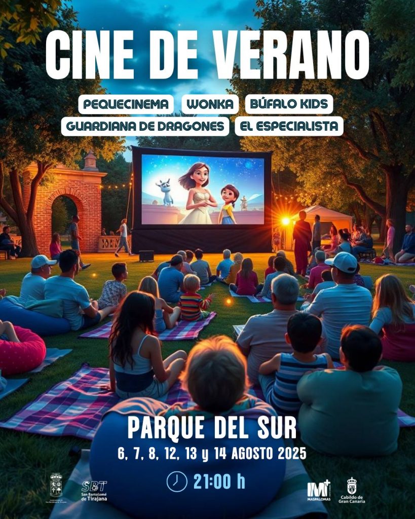 La Concejalía de Cultura del Ayuntamiento de San Bartolomé de Tirajana vuelve a convertir este verano el Parque Urbano del Sur en un escenario natural privilegiado donde los vecinos y veraneantes en el municipio podrán disfrutar de seis sesiones de cine infantil y familiar gratuitas.