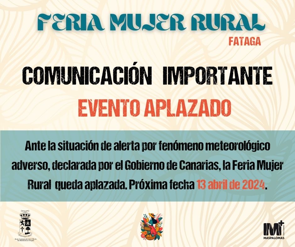 El Ayuntamiento de San Bartolomé de Tirajana ha decidido aplazar la I Feria Mujer Rural que estaba prevista para este sábado en Fataga debido a la situación de alerta por fenómeno meteorológico adverso decretada por el Gobierno de Canarias, y celebrarla el sábado 13 de abril.
