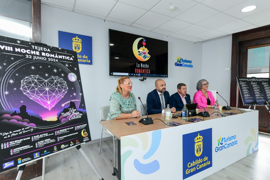 Octava edición de ‘La Noche Romántica de Tejeda, Una Noche Bajo Las Estrellas’, que regresa con una programación pensada para toda la familia. Este evento es una iniciativa que nace de Los Pueblos Más Bonitos de España, Italia, Valonia y Francia, indicó el alcalde de Tejeda, Francisco Perera, y tiene como eje central un gran beso que se realiza de manera coordinada con otros 400 pueblos europeos, según explicó éste en la presentación que se realizó en la sede de Turismo de Gran Canaria, entidad que colabora en el evento, junto al Gobierno de Canarias, y que contó con la presencia del alcalde de Tejeda, el consejero insular de Turismo, Carlos Álamo, y la concejala de Cultura y Festejos, Verónica Espino.
