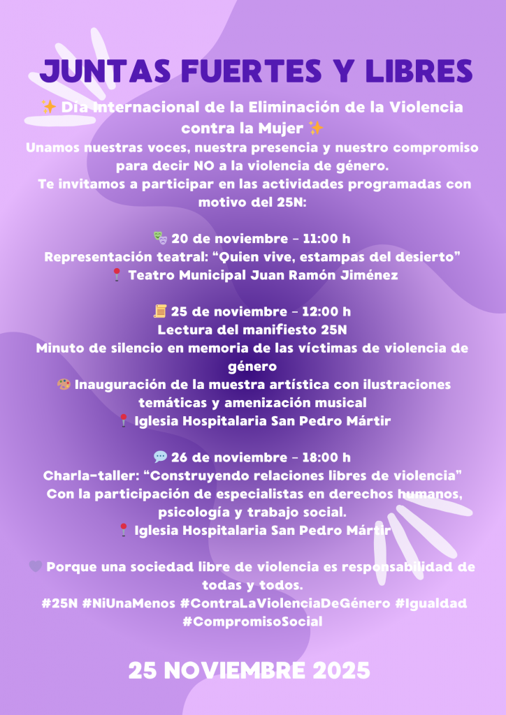 La iniciativa, bajo el lema Unamos nuestras voces, nuestra presencia y nuestro compromiso para decir “no” a la violencia de género, arrancará mañana jueves 20 de noviembre con la representación teatral Quien vive, estampas del desierto, a las 11.00 horas, en el Teatro Municipal Juan Ramón Jiménez, como antesala.