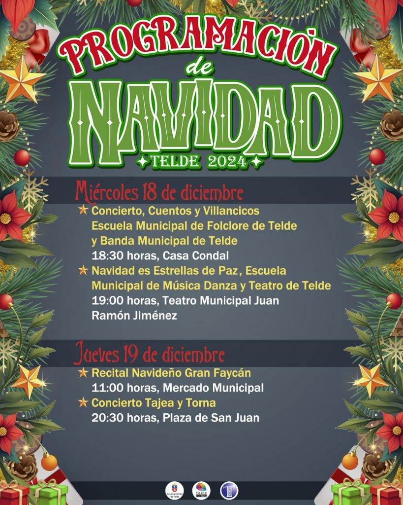 El Ayuntamiento de Telde, a través de la Concejalía de Cultura, que dirige Juan Martel, ofrece durante toda la semana, hasta el 22 de diciembre, una programación navideña variada destinada a toda la familia. Desde talleres infantiles, pasando por actuaciones teatrales o conciertos, entre otros, la ciudad se convertirá en estos días es el lugar perfecto para disfrutar de la cultura y la Navidad en estado puro.