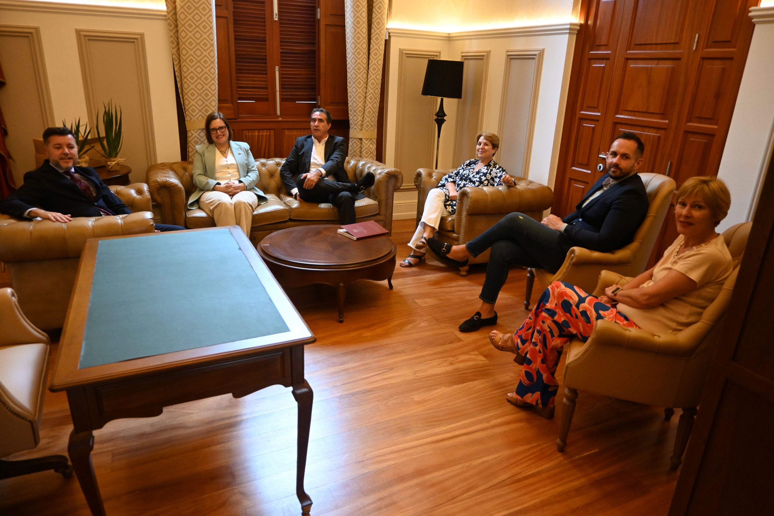 Teodoro Sosa Monzón, alcalde de Gáldar, mantuvo en la mañana de este martes una reunión con Candelaria Delgado, consejera de Bienestar Social, Igualdad, Juventud, Infancia y Familias del Gobierno de Canarias, y a Francis Candil, viceconsejero del área, en compañía de Julio Mateo Castillo, primer teniente de alcalde; Ana Teresa Mendoza Jiménez, concejala de Servicios Sociales y Dolores Delgado Jorge, concejala de Política del Mayor, en las Casas Consistoriales.