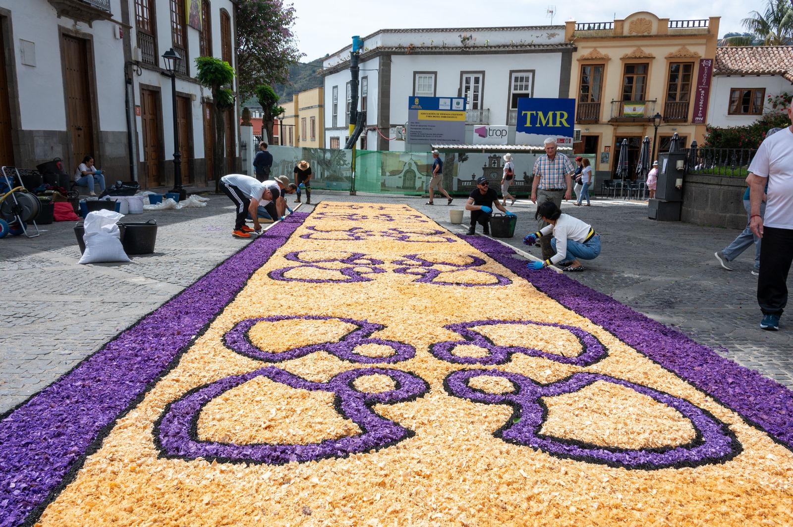 La confección de alfombras en las calles del Casco de Teror, Arbejales y El Palmar, por las que pasan las procesiones de la festividad, del Corpus Christi y del Sagrado Corazón de Jesús, tiene una larga historia en el municipio, y desde el consistorio municipal se hace un llamamiento para que esta tradición se siga manteniendo.
