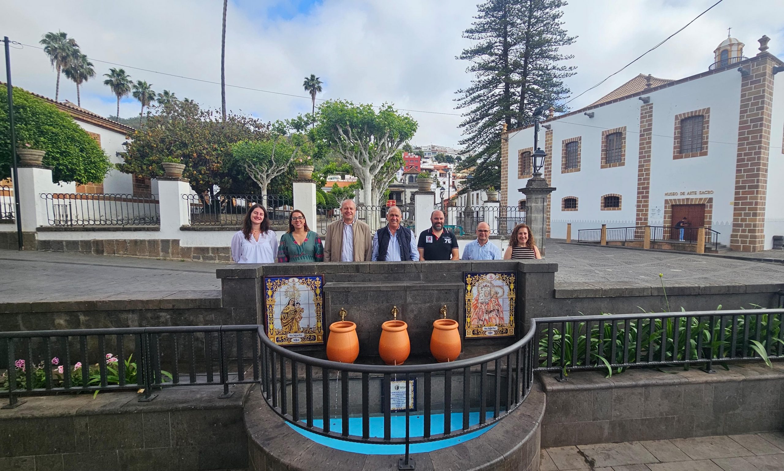 El Ayuntamiento de Teror ha recuperado este martes 10 de junio la fuente de la Araucaria situada en la trasera de la Basílica del Pino, junto al Punto Joven, en recuerdo al 25 aniversario del hermanamiento entre los municipios de Teror y Niebla (Huelva), unidos por sus patronas la Virgen del Pino.