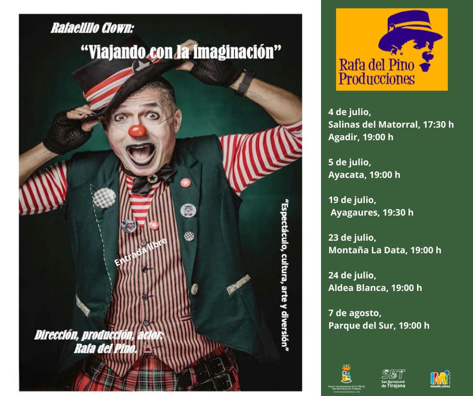 Por otro lado, el espectáculo imaginativo de Rafaelillo Clown, en el que se anima e implica a todo tipo de públicos, ya ha visitado Las Salinas del Matorral, Agadir y Ayacata. El 19 de este mes se ofrecerá en Ayagaures, y los días 23 y 24 en Montaña La Data y Aldea Blanca, respectivamente. El jueves 7 de agosto, a las siete de la tarde, se convertirá en un espectáculo general dentro del Parque Urbano del Sur.