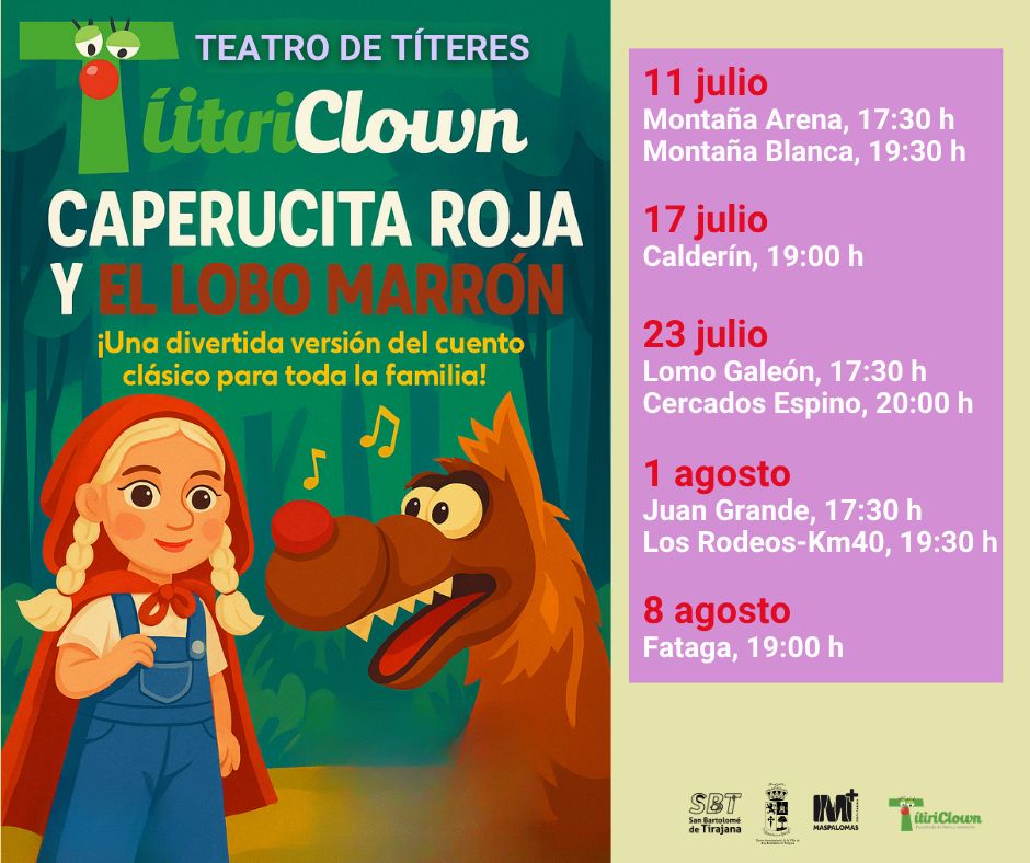 La Concejalía de Cultura del Ayuntamiento de San Bartolomé de Tirajana dirigida por la teniente de alcalde Elena Álamo Vega y coordinada por la edil Esther Delgado Sánchez está ofreciendo durante este verano en los pequeños barrios del municipio dos propuestas escénicas humorísticas distintas: la representación teatral de animación y títeres ‘Caperucita Roja y el lobo marrón’, y el espectáculo ‘Viajando con la imaginación’ del humorista Rafaelillo Clown.