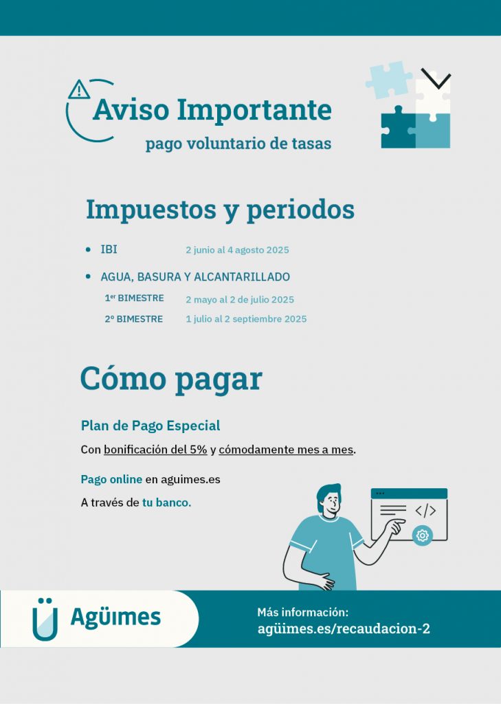 El plazo actualmente vigente para el pago del IBI es del 2 de junio al 4 de agosto de 2025. Para el abono de los tributos correspondientes al agua, basura y alcantarillado es del 2 de mayo al 2 de julio de 2025 (1er bimestre) y del 1 de julio al 2 de septiembre de 2025 (2º bimestre). El Ayuntamiento de Agüimes anima a toda la ciudadanía a anticiparse a los vencimientos, evitar recargos innecesarios y, si lo desean, acogerse al Plan de Pago Especial como fórmula cómoda, eficiente y económicamente ventajosa para cumplir con sus obligaciones tributarias. Hay que destacar que este sistema no genera intereses ni recargos y ofrece además una bonificación del 5% en el IBI y el Impuesto sobre Actividades Económicas (IAE).